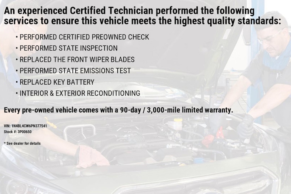 A great car and a great value! This vehicle has achieved Certified Pre-Owned status, by passing Nissan's comprehensive certification process, including a comprehensive 156 point inspection! With just over 20,000 miles on the odometer, this 4 door sedan prioritizes comfort, safety and convenience. Nissan prioritized fit and finish as evidenced by: fully automatic headlights, power moon roof, and remote keyless entry. Smooth gearshifts are achieved thanks to the 2.5 liter 4 cylinder engine, and for added security, dynamic Stability Control supplements the drivetrain.