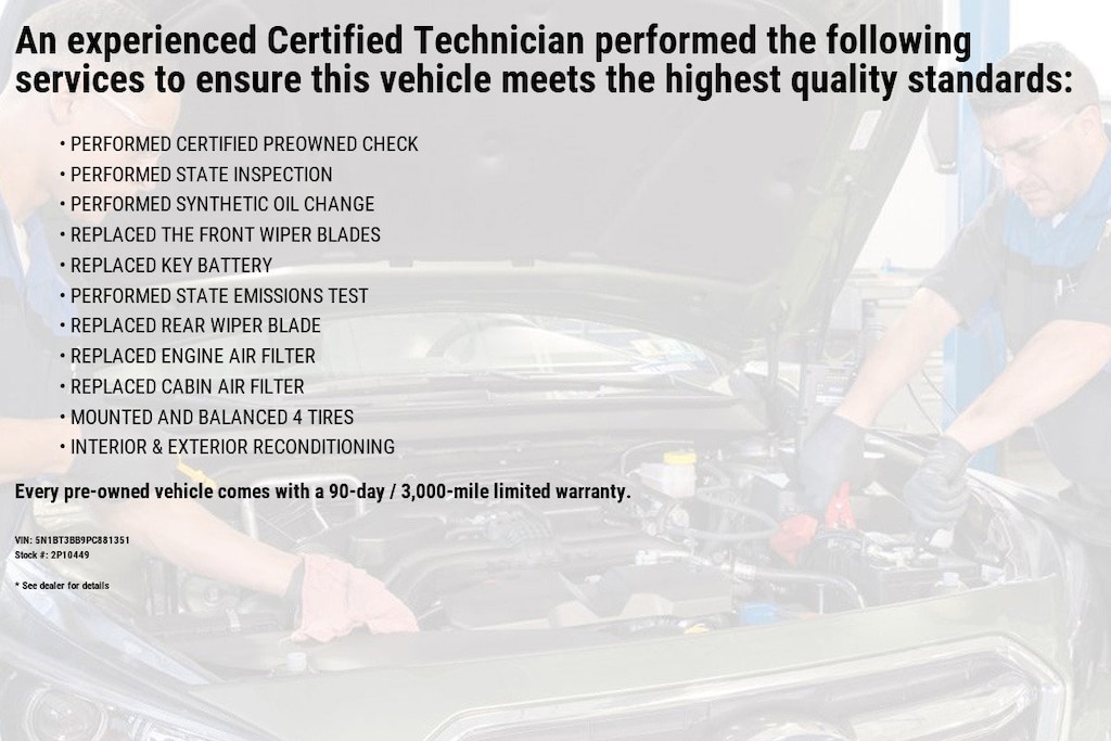 * 7 Year/100,000 Mile Limited Warranty, 24/7 Hour Roadside Assistance, Carfax Vehicle History Report, Plus 1 Year Pre-Paid Maintenance Included. Gas Powered Nissan Models Only. (for Nissan Certified program), 12-Months/12,000 Mile Limited Warranty, 24/7 Hour Roadside Assistance, Carfax Vehicle History Report, Plus 1 Complimentary Service Visit During the First Year of Ownership or First 15,000 Miles, Whichever Comes First. (for Certified Select program), 7-Year/100,000 Mile Limited Warranty, 1 Year Prepaid Maintenance Included in the First Year of Ownership or 15,000 Miles, Whichever Comes First. 100% Electric Nissan Models Only. (for EV Certified program)