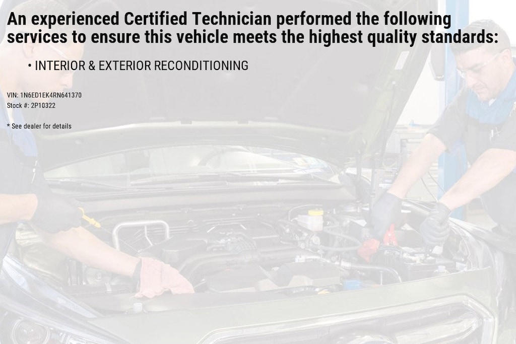 * 7 Year/100,000 Mile Limited Warranty, 24/7 Hour Roadside Assistance, Carfax Vehicle History Report, Plus 1 Year Pre-Paid Maintenance Included. Gas Powered Nissan Models Only. (for Nissan Certified program), 12-Months/12,000 Mile Limited Warranty, 24/7 Hour Roadside Assistance, Carfax Vehicle History Report, Plus 1 Complimentary Service Visit During the First Year of Ownership or First 15,000 Miles, Whichever Comes First. (for Certified Select program), 7-Year/100,000 Mile Limited Warranty, 1 Year Prepaid Maintenance Included in the First Year of Ownership or 15,000 Miles, Whichever Comes First. 100% Electric Nissan Models Only. (for EV Certified program)