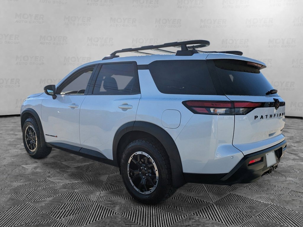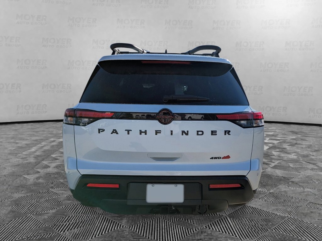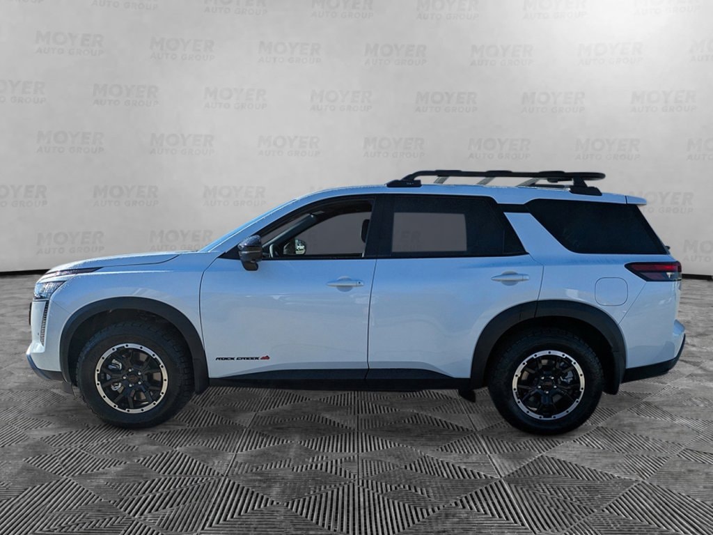 18" Unique Alloy Wheels, 3rd row seats: bench, 4-Piece Black Splash Guards, 4-Wheel Disc Brakes, 6 Speakers, ABS brakes, Air Conditioning, Alloy wheels, AM/FM radio: SiriusXM w/360L, Auto High-beam Headlights, Automatic temperature control, Brake assist, Delay-off headlights, Driver door bin, Driver vanity mirror, Dual front impact airbags, Dual front side impact airbags, Electronic Stability Control, Emergency communication system: NissanConnect Services, Four wheel independent suspension, Front anti-roll bar, Front Bucket Seats, Front Center Armrest, Front dual zone A/C, Front fog lights, Front reading lights, Fully automatic headlights, Garage door transmitter: myQ Connected Garage, Heated door mirrors, Heated Front Bucket Seats, Heated front seats, Illuminated entry, Knee airbag, Leatherette and Cloth Seating Surfaces, Low tire pressure warning, NissanConnect featuring Apple CarPlay and Android Auto, Occupant sensing airbag, Outside temperature display, Overhead airbag, Overhead console, Panic alarm, Passenger door bin, Passenger vanity mirror, Power door mirrors, Power driver seat, Power Liftgate, Power steering, Power windows, Premium Paint, Radio data system, Radio: AM/FM Audio System with NissanConnect, Rear air conditioning, Rear anti-roll bar, Rear reading lights, Rear side impact airbag, Rear window defroster, Rear window wiper, Reclining 3rd row seat, Remote keyless entry, Rock Creek All-Season Floor Liners and All-Season Cargo Area Protector, Roof rack, Security system, Speed control, Speed-sensing steering, Split folding rear seat, Spoiler, Steering wheel mounted audio controls, Tachometer, Telescoping steering wheel, Tilt steering wheel, Traction control, Trip computer, Turn signal indicator mirrors, Variably intermittent wipers. Everest White Pearl Tricoat 2026 Nissan Pathfinder Rock Creek 4WD 9-Speed Automatic 3.5L V6 DOHC