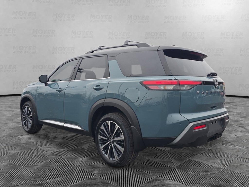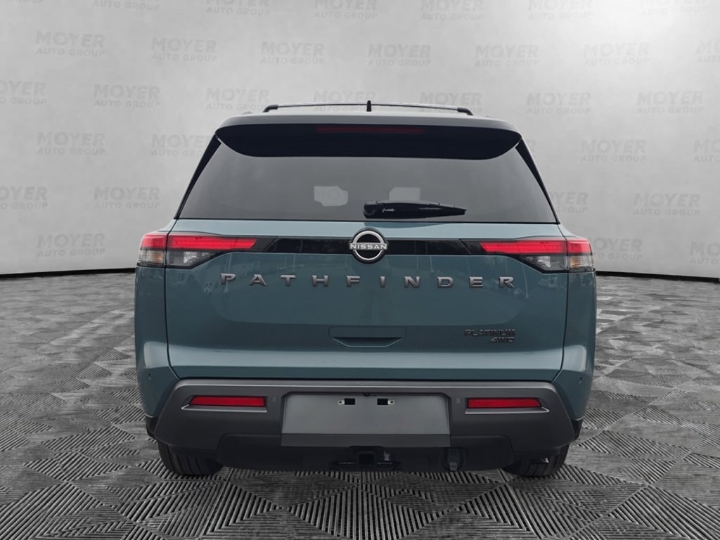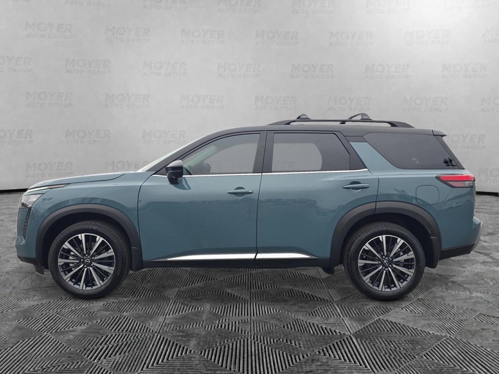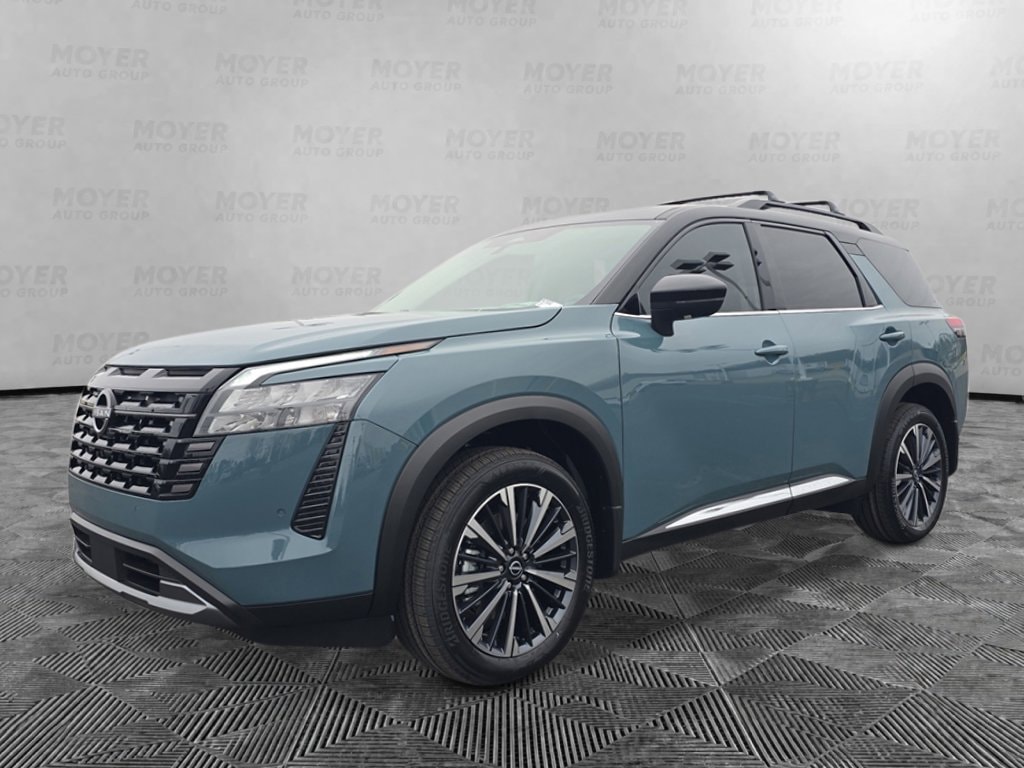 13 Speakers, 3rd row seats: bench, 4-Piece Black Splash Guards, 4-Wheel Disc Brakes, ABS brakes, Air Conditioning, Alloy wheels, AM/FM radio: SiriusXM w/360L, Auto High-beam Headlights, Auto tilt-away steering wheel, Auto-dimming Rear-View mirror, Automatic temperature control, Bench Seat Carpeted Floor Mats, Bodyside moldings, Bose Premium Audio System, Brake assist, Bumpers: body-color, Cargo Area Protector, Cargo Net, Cargo Package, Climate Controlled Front Bucket Seats, Cross Bars, Delay-off headlights, Driver door bin, Driver vanity mirror, Dual front impact airbags, Dual front side impact airbags, Electronic Stability Control, Emergency communication system: NissanConnect Services, First Aid, Four wheel independent suspension, Front anti-roll bar, Front Bucket Seats, Front Center Armrest, Front dual zone A/C, Front reading lights, Fully automatic headlights, Garage door transmitter: HomeLink, Heads-Up Display, Heated door mirrors, Heated front seats, Heated rear seats, Heated steering wheel, Illuminated entry, Knee airbag, Low tire pressure warning, Memory seat, NissanConnect featuring Apple CarPlay and Android Auto, Occupant sensing airbag, Outside temperature display, Overhead airbag, Overhead console, Panic alarm, Passenger door bin, Passenger vanity mirror, Power door mirrors, Power driver seat, Power Liftgate, Power moonroof, Power passenger seat, Power steering, Power windows, Premium Paint and 2-Tone Roof, Radio data system, Radio: AM/FM Audio System with NissanConnect, Rain sensing wipers, Rear air conditioning, Rear anti-roll bar, Rear reading lights, Rear seat center armrest, Rear side impact airbag, Rear window defroster, Rear window wiper, Reclining 3rd row seat, Remote keyless entry, Security system, Semi-Aniline Leather-Appointed Seating Surfaces, Speed control, Speed-sensing steering, Speed-Sensitive Wipers, Split folding rear seat, Spoiler, Steering wheel memory, Steering wheel mounted audio controls, Tachometer, Telescoping steering wheel, Tilt steering wheel, Traction control, Trip computer, Turn signal indicator mirrors, Variably intermittent wipers, Ventilated front seats, Wheels: 20" Machined Alloy. Baltic Teal/Super Black 2026 Nissan Pathfinder Platinum 4WD 9-Speed Automatic 3.5L V6 DOHC