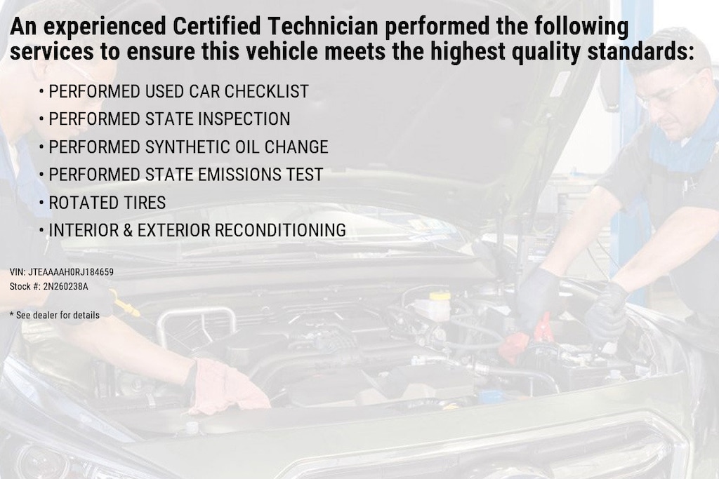 Odometer is 11458 miles below market average! Continuously Variable (ECVT) 2.5L 4-Cylinder DOHC 16V 4-Wheel Disc Brakes, 6 Speakers, ABS brakes, Air Conditioning, Alloy wheels, AM/FM radio: SiriusXM, Apple CarPlay/Android Auto, Auto High-beam Headlights, Auto-dimming Rear-View mirror, Automatic temperature control, Axle Ratio: TBD, Brake assist, Bumpers: body-color, Chrome wheels, Driver door bin, Driver vanity mirror, Dual front impact airbags, Dual front side impact airbags, Electronic Stability Control, Emergency communication system: Safety Connect (1-year trial), Exterior Parking Camera Rear, Four wheel independent suspension, Front anti-roll bar, Front Bucket Seats, Front Center Armrest, Front dual zone A/C, Front fog lights, Front reading lights, Fully automatic headlights, Garage door transmitter: HomeLink, Heated Front Bucket Seats, Heated front seats, Illuminated entry, Knee airbag, Leather Shift Knob, Leather steering wheel, Low tire pressure warning, Memory seat, Navigation System, Occupant sensing airbag, Outside temperature display, Overhead airbag, Overhead console, Panic alarm, Passenger door bin, Passenger vanity mirror, Power door mirrors, Power driver seat, Power Liftgate, Power steering, Power windows, Radio data system, Radio: Premium Audio, Rear anti-roll bar, Rear seat center armrest, Rear window defroster, Rear window wiper, Remote keyless entry, SofTex Seat Trim, Speed control, Speed-sensing steering, Split folding rear seat, Spoiler, Steering wheel mounted audio controls, Telescoping steering wheel, Tilt steering wheel, Traction control, Trip computer, Turn signal indicator mirrors, Variably intermittent wipers, Wheels: 7 x 19" Alloy.
